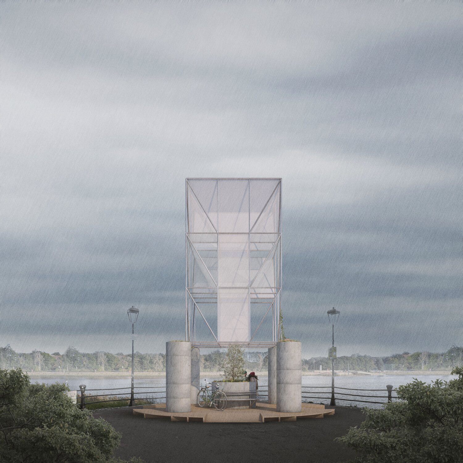 ‘To Flow Together’ proposed a concrete and lightweight metal structure, situated by the Lagan towpath which would collect falling rainwater in a central planter encircled by bench seating to create a place to take shelter, commune, and experience the collection of rainwater.